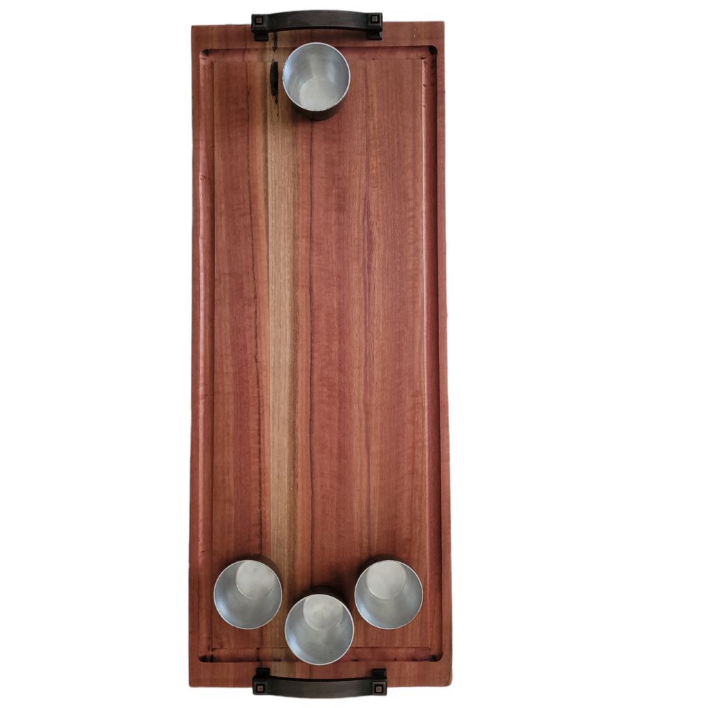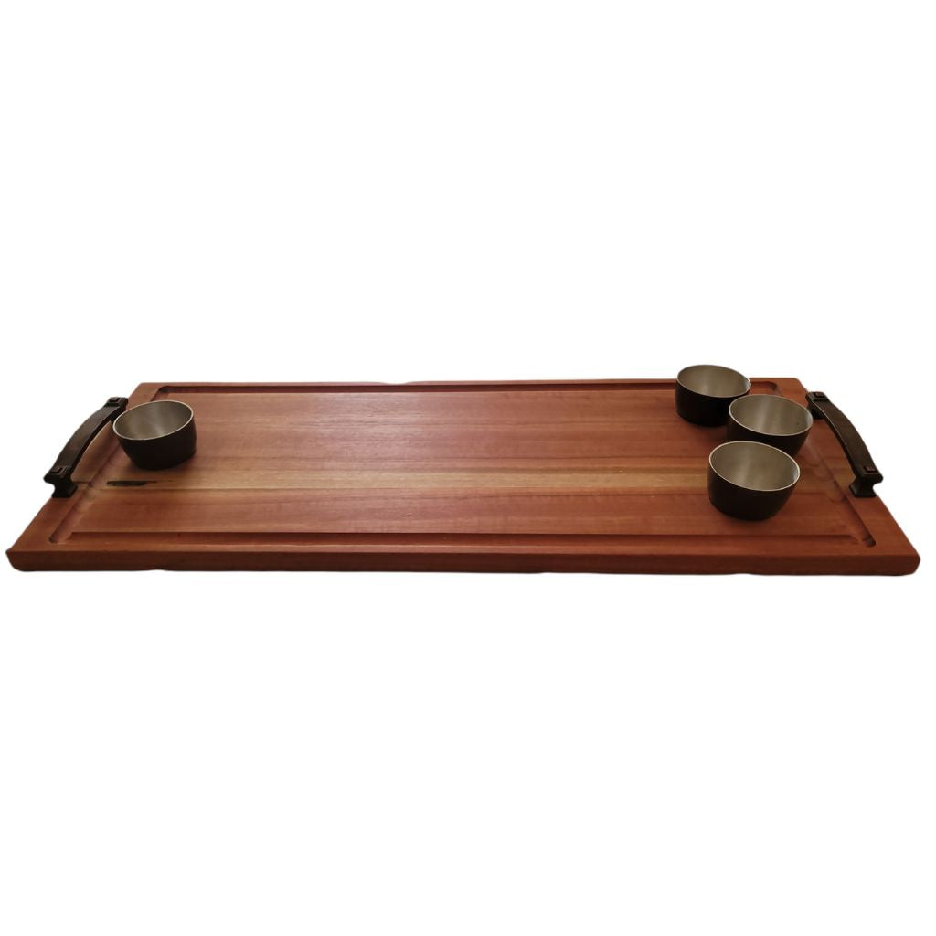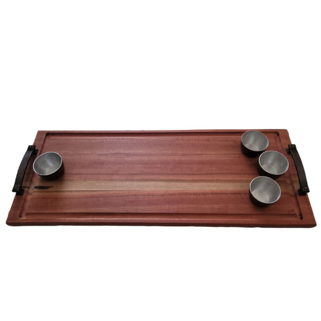 Die Ysterhoutsnyplank met Sousbekers bied optimale snyspasie en gerief vir enige kombuis. Dit beskik oor 'n sapgroef om vloeistowwe binne die bord te bevat en vier souskoppies vir maklike bestanddeelberging. Die bord is gemaak van duursame ysterhout vir 'n langdurige kookervaring.