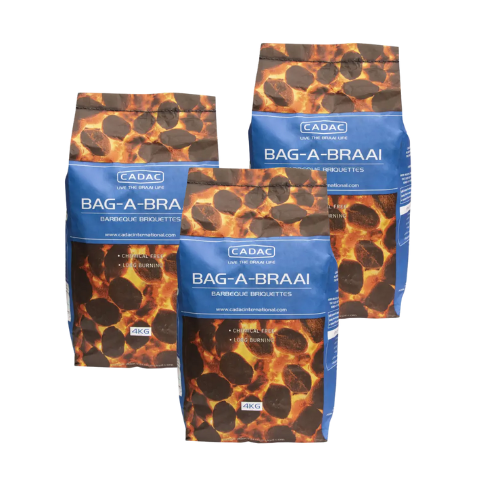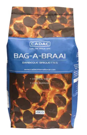 The Bag‑A‑Braai Charcoal Briquette is CADAC’s own high-performance briquette blend, sold in a conveniently pre‑measured 4.15 kg package (approx. 4 kg net)