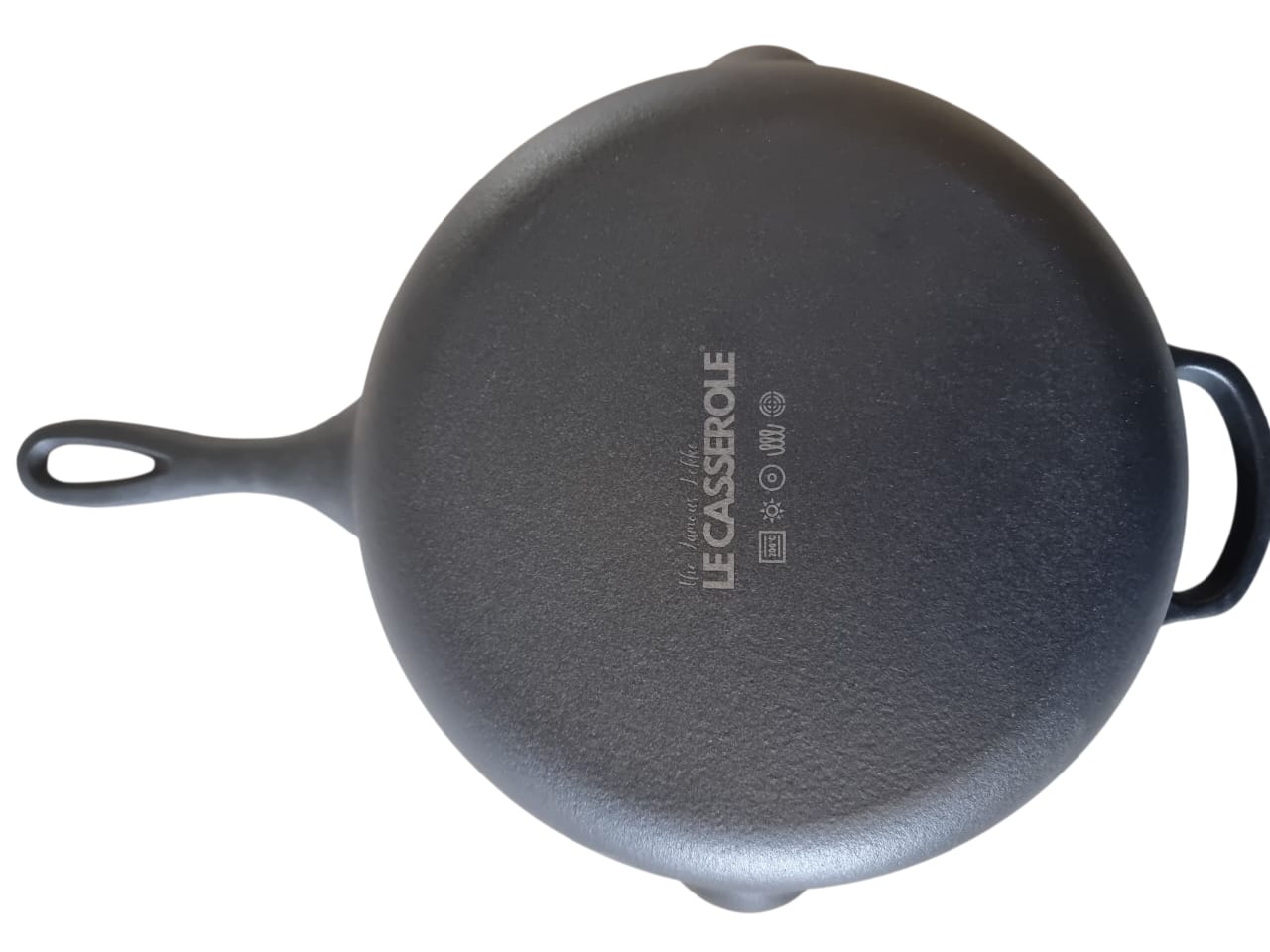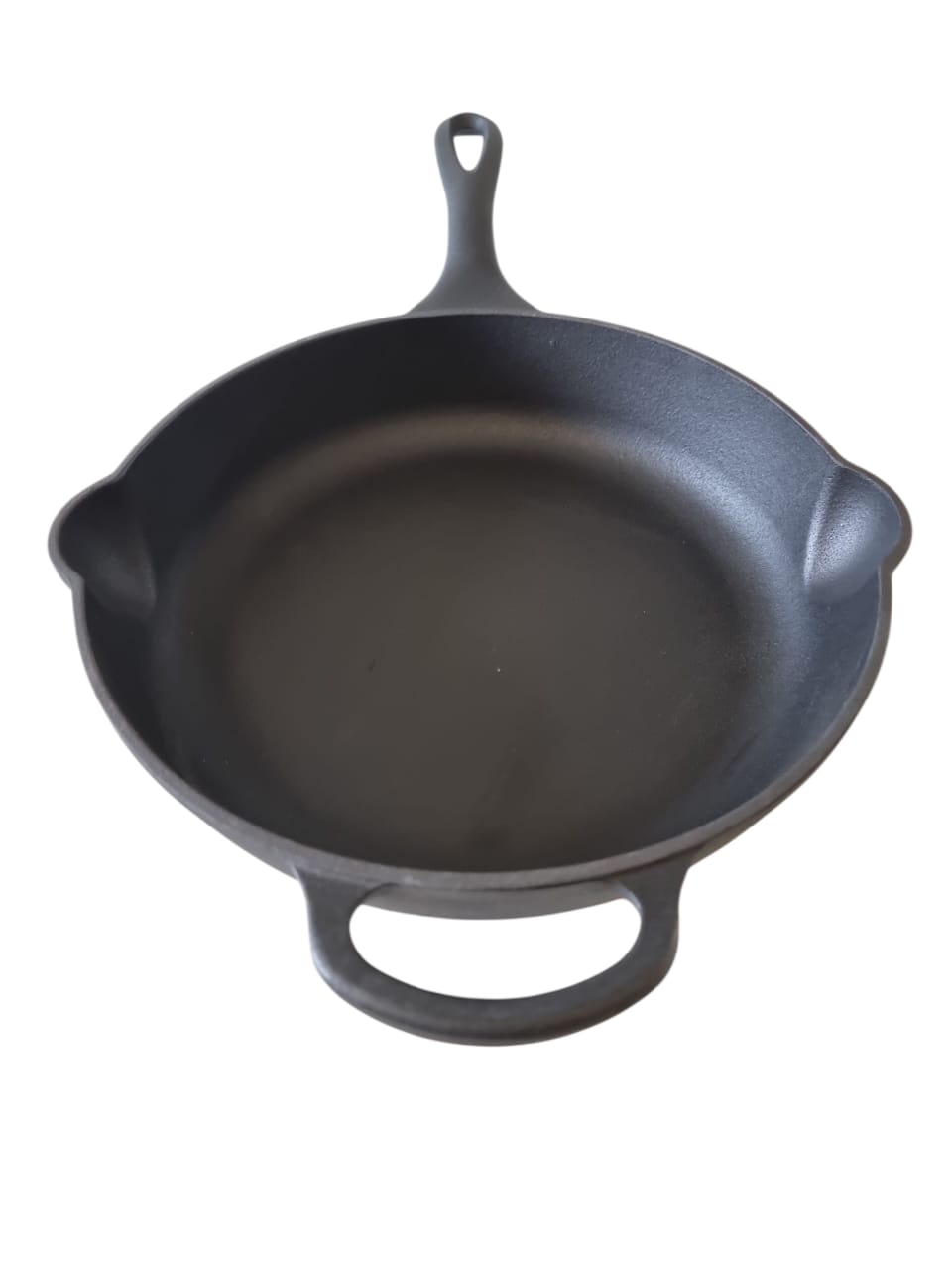 Handles: Ergonomic design featuring a stay‑cool wooden main handle plus a cast-iron “helper” grip—makes lifting filled pans easier