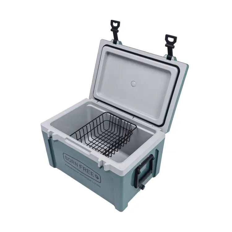 This 50-liter cooler is perfect for your braai occasions, offering ample space and impressive insulation. Made with high-density, eco-friendly polyurethane, it keeps your items cold for up to 6 days. The cooler features tie-down rubber straps, one of which includes a handy bottle opener for your convenience. It also has a side drain for quick water drainage and a quality sealing gasket that helps maintain freezer-like coldness. For added convenience, a wire basket is included to keep smaller items organized. Easy-grip side handles make it simple to transport, making this cooler an essential companion for any outdoor gathering!'
