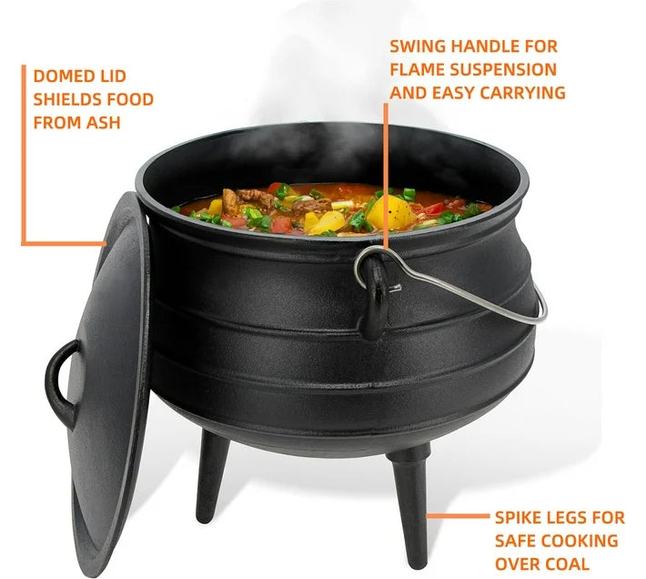 The Cast Iron Potjie No. 25 is an extra-large, heavy-duty, three-legged pot ideal for cooking hearty stews, soups, and slow-cooked meals over an open fire. Made from high-quality cast iron, it ensures even heat distribution and excellent heat retention. The domed lid helps lock in moisture and flavor, while the sturdy three-legged design provides stability on coals or fire pits. Perfect for large gatherings and outdoor cooking, this potjie is built for durability and rich, flavorful meals.
