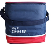 The bag features a bold navy blue and red exterior with a playful “Enjoy it! COOLER” print on the front. Made from durable, water-resistant polyester, it includes thick thermal insulation to keep drinks and snacks cold for hours. A zippered lid ensures secure storage, and the adjustable shoulder strap offers comfortable hands-free carrying.