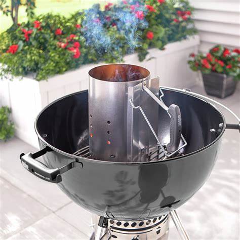 Weber Rapidfire Chimney Starter: Constructed from aluminised steel, this chimney starter features a cone-shaped bottom grate for optimal airflow, ensuring fast and even ignition of charcoal. Its two-handle design offers enhanced control when pouring hot coals.